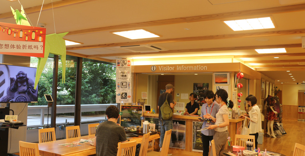 走進溫暖色調的奈良縣外國旅客交流中心,已有不少歐美旅客或站或坐與服務人員交談著,這裡的空間也和印象中的服務中心略有不同,除了兩面式的櫃檯外,還多了一張長桌、數張小圓桌與沙發雅座,倒真與民宿共用空間的溫馨感很雷同。最獨特的,當屬軟體內容了,英中韓外語對應、可免費當日寄放行李、兌換日幣、租借單車、協助預約飯店、鐵路券販售等已是相當齊備的服務。每日,都有不同的文化體驗在此輪番上陣,免費的摺紙教室、水果品嚐、古琴音樂惠、和服或浴衣體驗,還有五百日圓就有的日式書法課、日式茶道課。