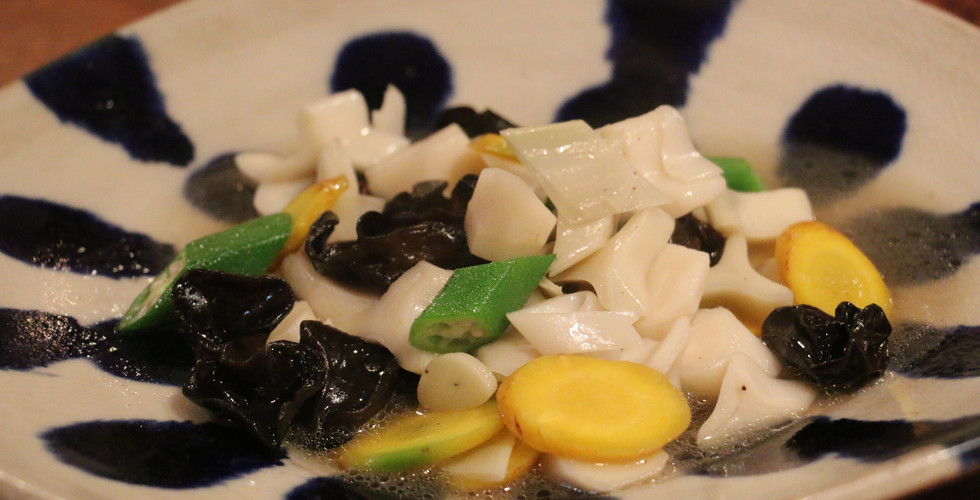 边銀先生的「石垣島辣油」紅遍全日本及台灣,曾替張藝謀拍片的他,美學底蘊深厚,小小的一間店,從空間、菜色和味道都是上上之作。尤感動的是,透過廚房出菜口的小窗,我看到他整個晚上都在裡頭煮著菜、忙進忙出,實屬不易。或許,這就是當晚料理令人由衷喜愛的原因,因為裡頭充滿了边銀先生的熱情與付出。